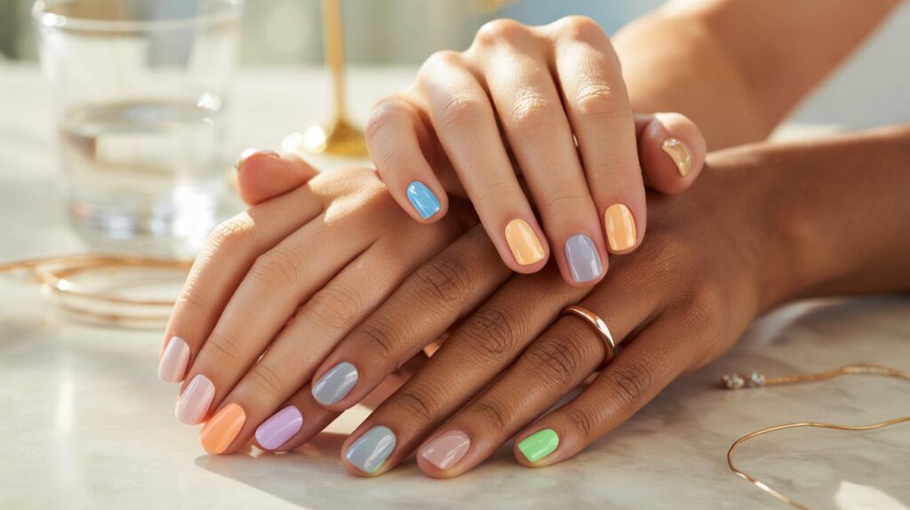 Em outubro de 2025, a cartela do momento privilegia tons pastel arejados, soap nails de acabamento aquoso e metálicos delicados. A estética limpa e luminosa valoriza a unha natural, mas abre espaço para detalhes criativos que elevam o visual sem pesar.